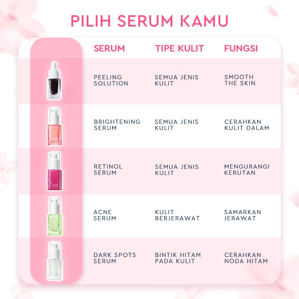 Temukan rangkaian produk pencerah kulit dari Glad2Glow yang dirancang untuk memberikan hasil maksimal dan perawatan optimal bagi kulit Anda. Paket ini mencakup enam serum unggulan: GLAD2GLOW AHA BHA PHA INTENSIVE PEELING SOLUTION, Glad2Glow Pomegranate 10% Niacinamide Power Bright Serum, Glad2Glow Centella Salicylic Acid Power Clear Acne Serum, Glad2Glow Peach Retinol Serum, Glad2Glow Yuja Symwhite 377 Dark Spot Serum, dan Glad2Glow Jeju Tangerine Vita C Power Bright Glow Serum. Setiap serum memiliki tekstur ringan yang mudah menyerap, aman digunakan setiap hari, dan diformulasikan dengan bahan-bahan berkualitas seperti Niacinamide, Pomegranate, Alpha arbutin, Centella asiatica, Salicylic acid, dan ekstrak Yuja untuk mencerahkan, menyamarkan bekas jerawat, serta menenangkan kulit berjerawat. Dengan ukuran yang praktis dan cara perawatan yang mudah, produk ini cocok untuk semua jenis kulit, terutama bagi Anda yang ingin mendapatkan kulit halus, lembut, dan bercahaya. Manfaatkan keunggulan setiap serum untuk meraih tampilan kulit yang sehat dan bersinar.