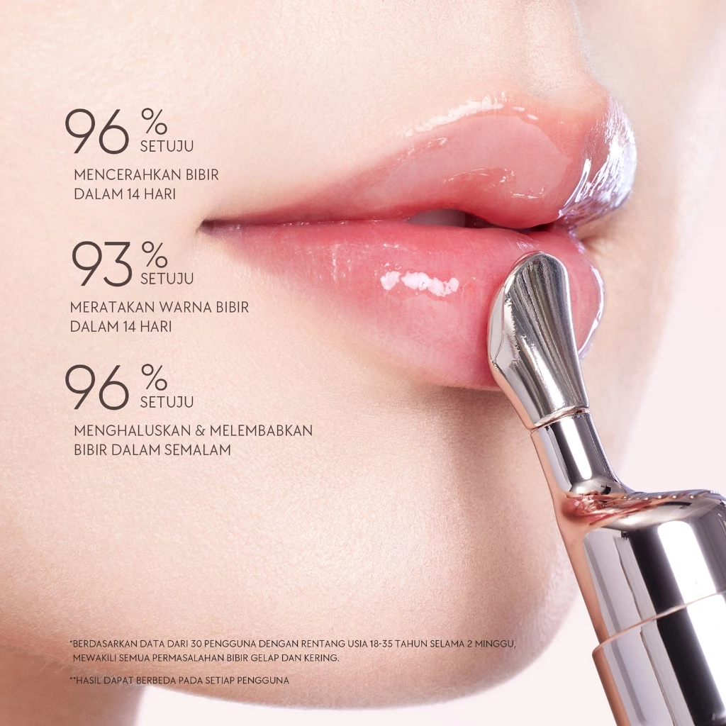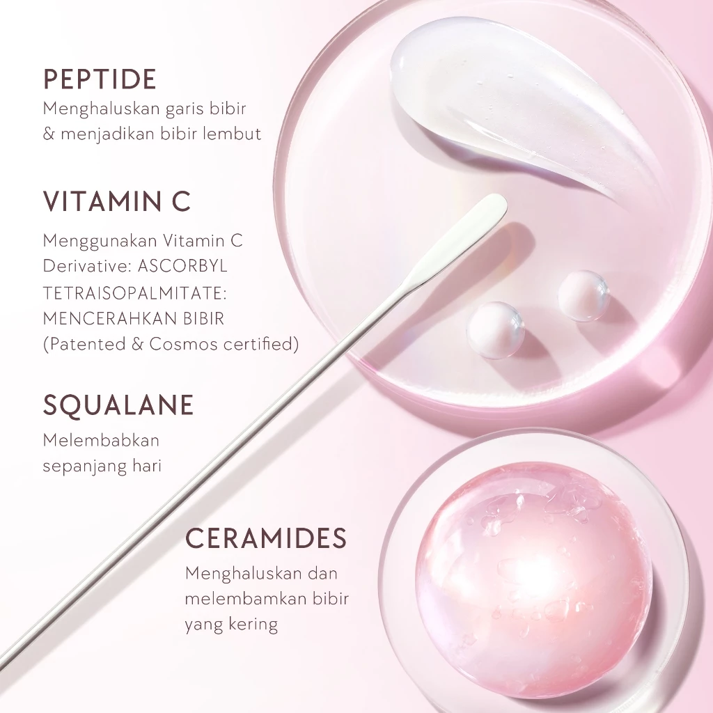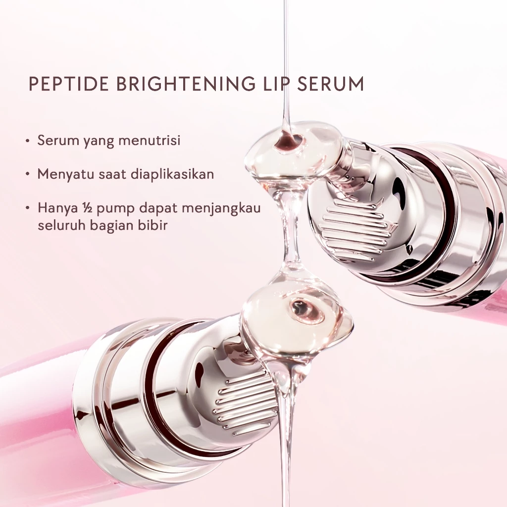 Peptide Brightening Lip Serum adalah lip serum inovatif yang menawarkan tiga keunggulan utama: mencerahkan, menghaluskan, dan meratakan warna bibir. Dirancang khusus untuk mengatasi masalah bibir gelap, two-toned, dan kering, produk ini menggunakan vacuum pump dengan aplikator metal yang memberikan sensasi dingin saat diaplikasikan, membuatnya mudah digunakan setiap hari. Diformulasikan tanpa pewarna, serum ini mengandung Peptide dan Squalane yang bekerja secara sinergis untuk memberikan nutrisi intensif dan mencerahkan bibir dalam waktu 14 hari. Dengan derivat yang telah dipatenkan COSMOS, serum ini lebih lembut dan cepat dalam mencerahkan bibir. Tekstur uniknya yang balmy dengan finish glossy dan plumpy memberikan kelembaban tanpa rasa lengket. Ukuran produk ini adalah 6.5 ML, menjadikannya pilihan ideal untuk perawatan bibir yang efektif dan praktis.