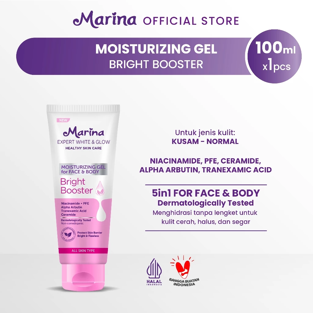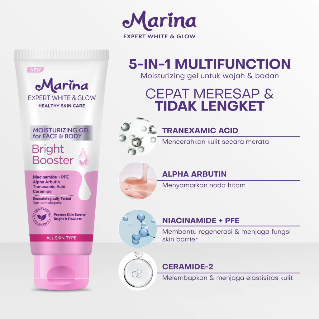 Marina Expert White & Glow Moisturizing Gel for Face & Body Bright Booster 100 ml adalah gel multifungsi yang menawarkan sensasi dingin dan dirancang untuk memberikan kelembapan serta hidrasi optimal pada kulit wajah dan tubuh. Dengan tekstur ringan yang cepat meresap, produk ini tidak meninggalkan rasa lengket. Mengandung Advanced Brightening Formula yang diperkaya dengan Duo-Expert Nia-Ceramide (Niacinamide dan Ceramide) untuk menjaga fungsi barrier kulit agar tetap cerah dan lembab, serta 1000mg Vitamin C dan Ekstrak Delima yang membantu meratakan warna kulit dan melindungi dari radiasi blue light. Selain itu, gel ini dilengkapi dengan perlindungan UV terhadap sinar UVA dan UVB, serta bebas dari alkohol dan paraben. Dengan manfaat 5 in 1, Marina Expert White & Glow Moisturizing Gel dapat digunakan sebagai pelembab wajah, base makeup, sleeping mask, pelembab tubuh, dan perawatan kuku, menjadikannya pilihan ideal untuk kulit halus, cerah, dan lembut.