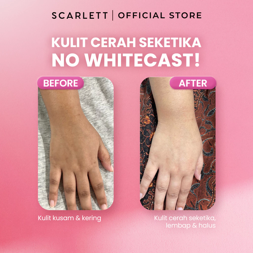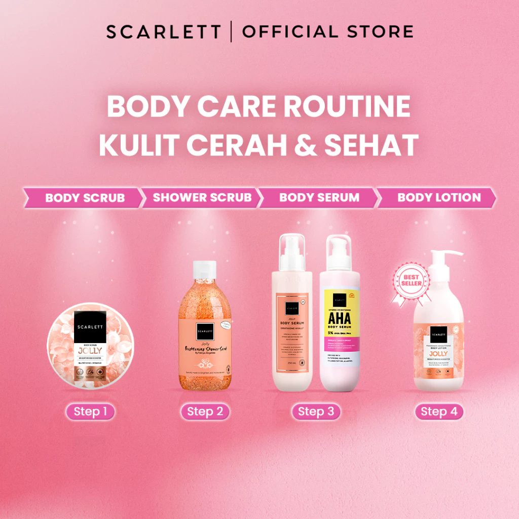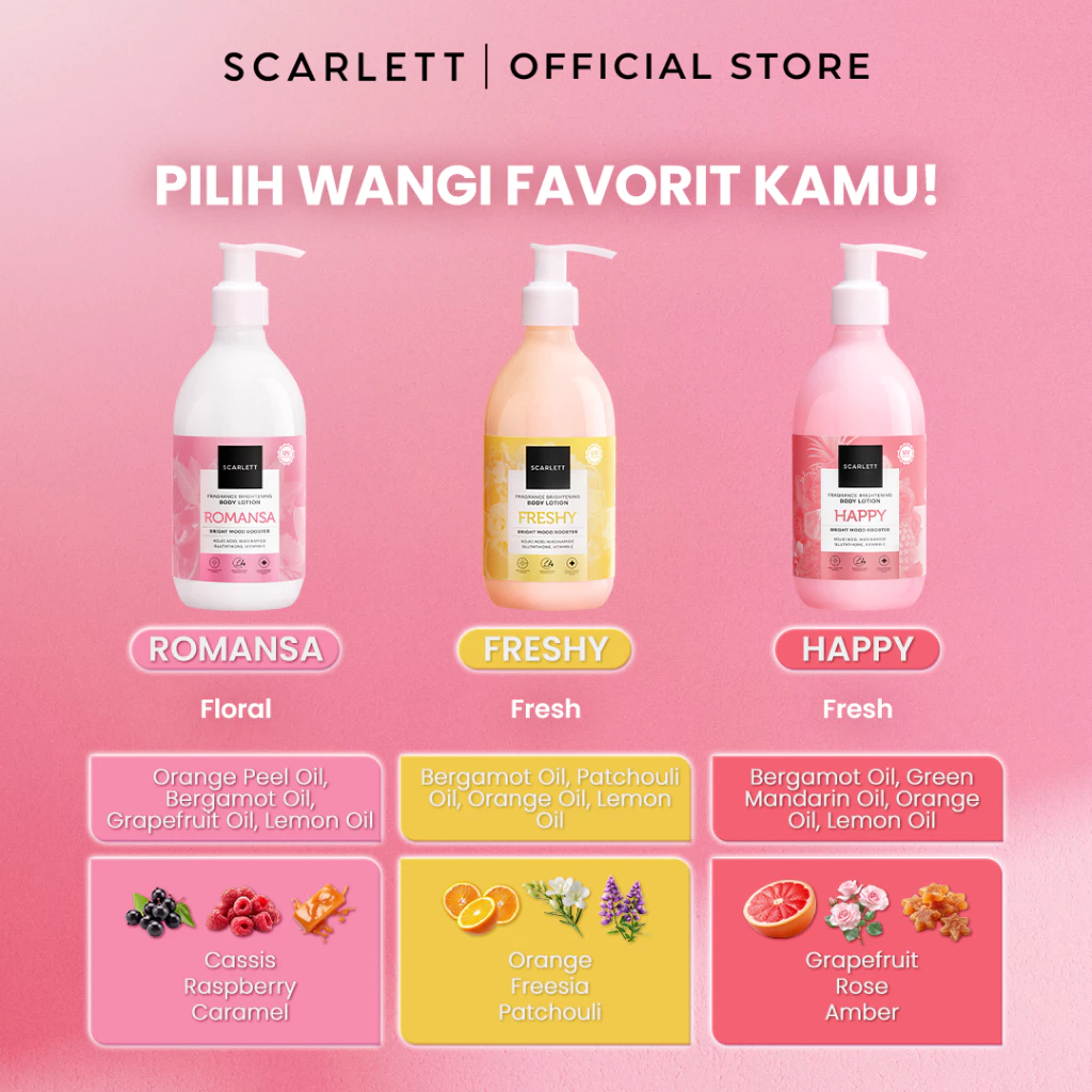 Nikmati pengalaman masa adulting yang lebih ceria dengan Scarlett Body Lotion, solusi mood-boosting yang efektif berkat Bright Booster Formula yang mengandung Glutathione, Niacinamide, dan Kojic Acid. Dengan wangi mewah dari 4 Mood-Boosting Essential Oils yang tahan lama hingga 9 jam, produk ini hadir dalam lima varian menarik: Scarlett Whitening Body Lotion Jolly, Charming, Romansa, Freshy, dan Happy. Setiap kemasan dirancang dengan ukuran praktis, menjadikannya mudah digunakan dan dibawa kemana saja. Untuk perawatan terbaik, cukup oleskan body lotion ini pada tangan, kaki, dan bagian tubuh lainnya, lalu usapkan secara merata. Gunakan secara rutin setiap hari untuk hasil maksimal dan rasakan kulit yang lebih cerah serta mood yang selalu baik! Dapatkan Scarlett Body Lotion dan rasakan keunggulannya sekarang juga!