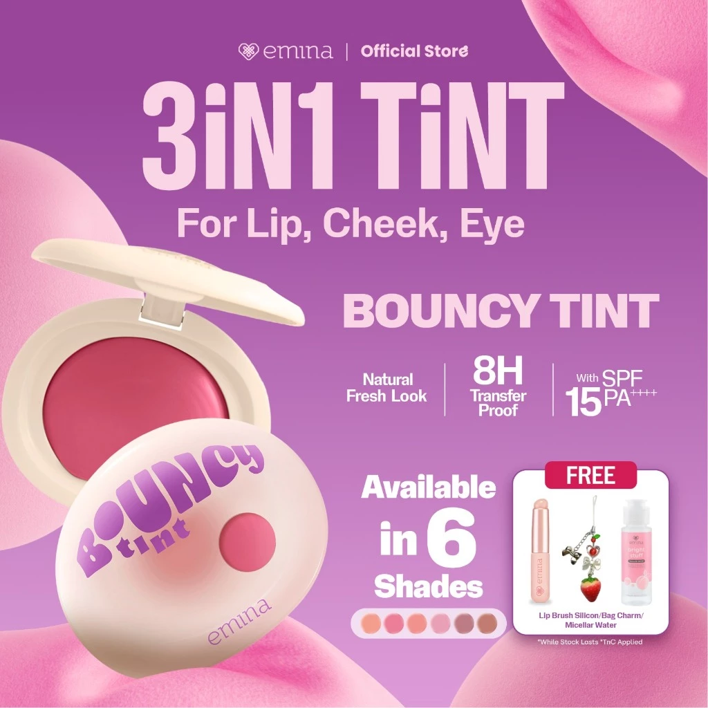 Emina Bouncy Tint adalah produk lip & cheek terbaru yang menawarkan tekstur bouncy ringan, memberikan warna yang menyatu dengan halus sepanjang hari. Dalam satu paket, Anda akan menemukan produk ini yang mengandung smooth blur technology, menciptakan efek blurring instan yang mengurangi tekstur pada bibir hingga 50.88% setelah pemakaian, serta menurunkan kekeringan hingga 46?rkat moisturizing butter blend. Dengan ukuran yang praktis dan dilengkapi SPF 15 PA+++, Emina Bouncy Tint tidak hanya melindungi bibir dari sinar matahari, tetapi juga memberikan hasil matte yang sempurna tanpa kesan patchy saat digunakan di bibir, pipi, atau mata. Keunggulan produk ini terletak pada smooth blurry flush look yang menyamarkan garis-garis halus, kemampuannya sebagai multi-purpose makeup, serta formula long lasting stain yang membuatnya ideal untuk tampilan natural sehari-hari. Dapatkan Emina Bouncy Tint untuk pengalaman makeup yang ringan, lembap, dan tahan lama!